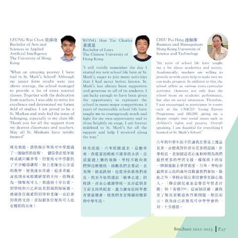 my heart.’ 聖馬可的師長和同學總會熱心地幫助 間,師長及同學們給予我的支持和鼓 了一趟愉快的旅程。 儘管我在低年級 來,我從當初稚嫩不懂事的小孩,長 學校裏,老師願意花心血和時間為我們