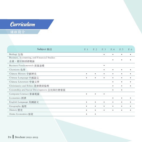 Subject 科目 F. 1 F. 2 F. 3 F. 4 F. 5 F. 6 Subject 科目 F. 1 F. 2 F. 3 F. 4 F. 5 F. 6