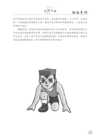 詩 語 說 林 振振有詞 班和興趣班並不能有效幫助孩子成長。家長應因材施教,不只是單一注重成 績,而是發掘他們獨特的才能,讓他們有足夠的空間發展所長,才能真正地 幫助孩子成長。 歸根究底,還是因為家長普遍相信書中自有黃金屋,努力讀書就能有光 明的前途的傳統觀念所誤導,卻錯以為不停灌輸孩子知識就能讓孩子過上更 好的生活,忽略了孩子其他方面發展的潛能。如果他們能釐清概念,放棄必 須嬴在起跑線的觀念,相信更能幫助孩子邁向成功。 15