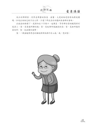 詩 語 說 林 愛意滿溢 現在的那個家,仍然是那麼的熟悉、溫馨,久違的味道徐徐地將我圍 繞。但現在奶奶已經不在人間,只遺下那淡淡的回應和熱香餅的香味。 在孤寂的路燈下,我徘徊在十字路口,迷惆着,等待那份家的暖陽照到 我身上。家,是葉能所歸的根﹔家,是孤雁所能擁抱的海﹔家,是船所能倚 靠的岸﹔家,是溫馨的港灣。 家,一種溫暖與思念的輪迴深深地烙印在心底,我,想回家。 43